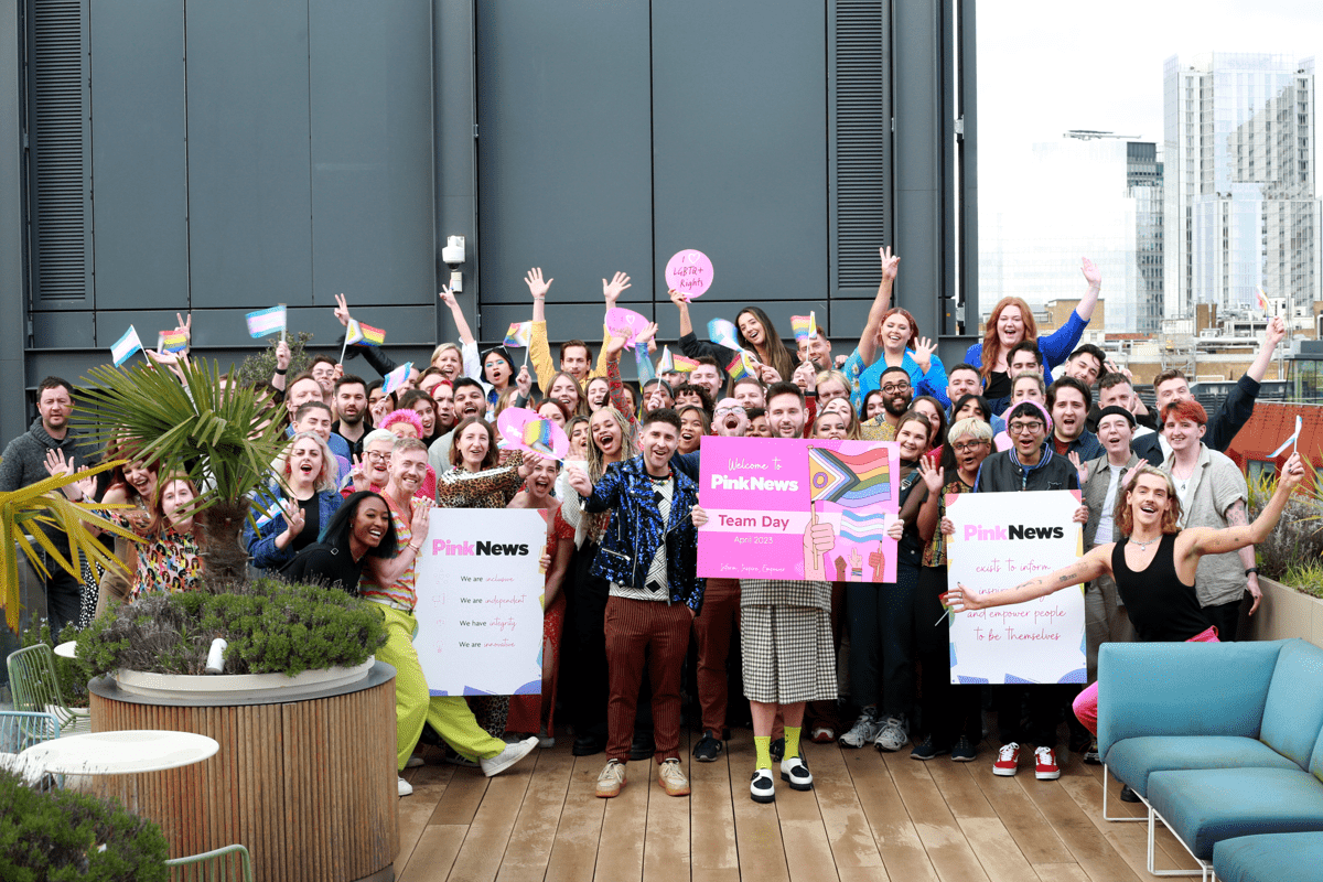 Image description: The PinkNews team standing outside, celebrating and having fun.